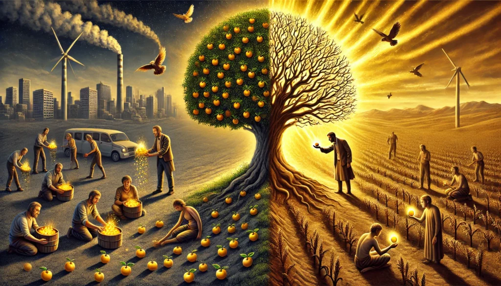 Then there was another man, much like the first, standing under the same kind of tree. But instead of waiting, he looked around. With the strength he had, he gathered fallen branches and built a simple ladder. He climbed and picked as many fruits as he could carry. Then he walked to the village and gave them away. The villagers, grateful for his generosity, asked why he had done so. He simply said, “I had the strength to climb today, and there was fruit within reach. So I took what I could and shared it.”